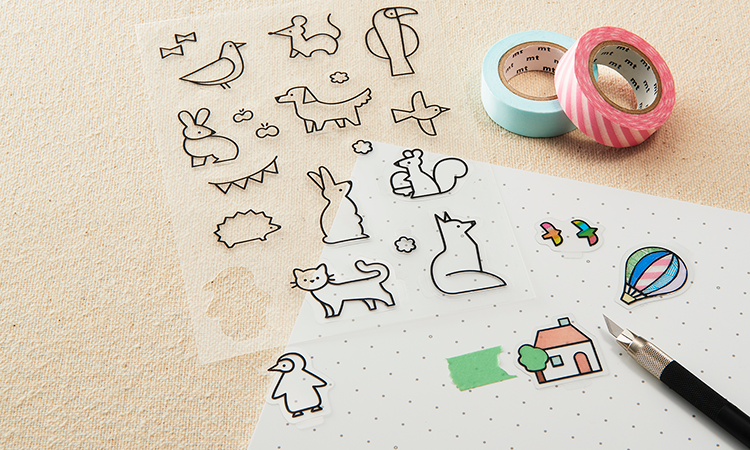 シートの枠線にそってマスキングテープを貼って切るだけ!ぬりえ感覚でオリジナルシールがカンタンに作れます。デザインもいろいろあるので、用途や気分に合わせて自分好みのシール作りを楽しめます。