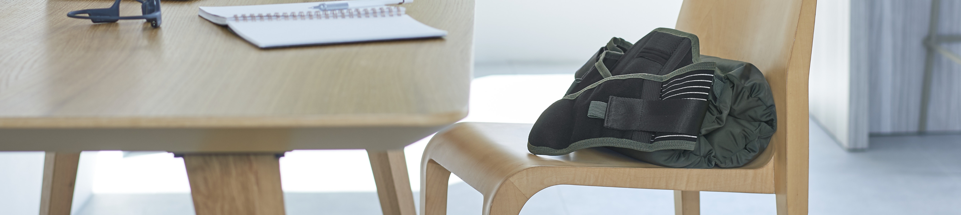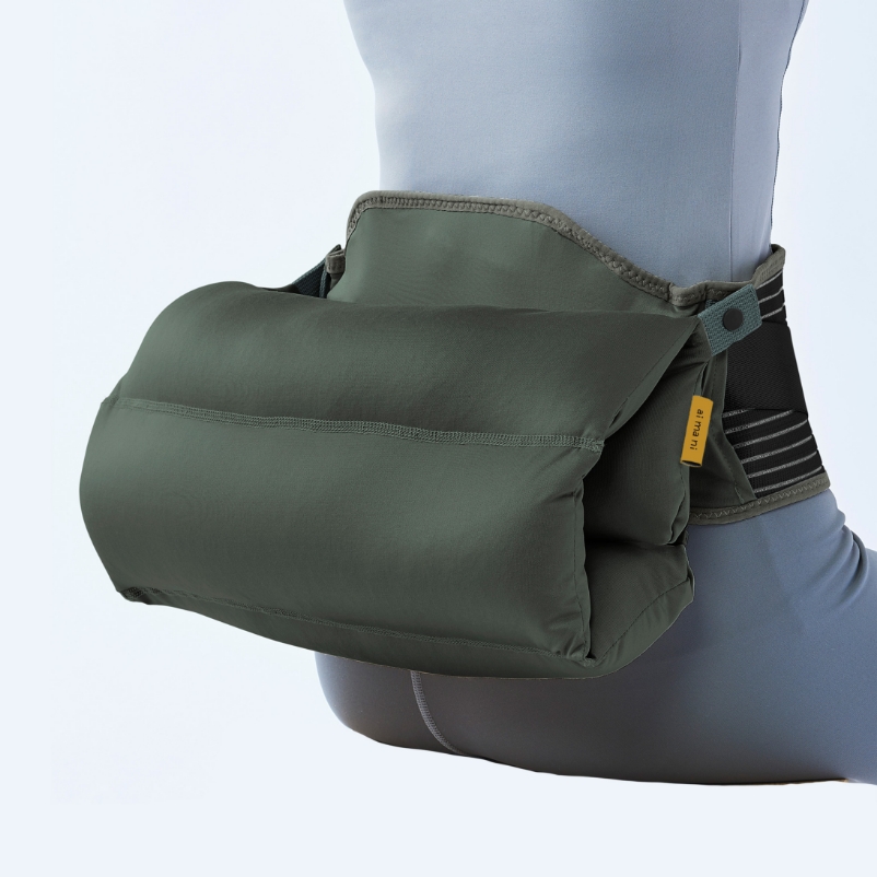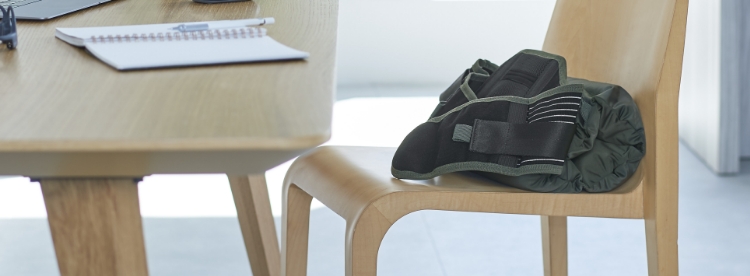 クッションを丸めてスナップボタンで留めると、腰のS字カーブに優しくフィットします。直接腰に装着しているので、より姿勢を保ちやすいです。