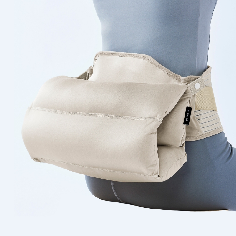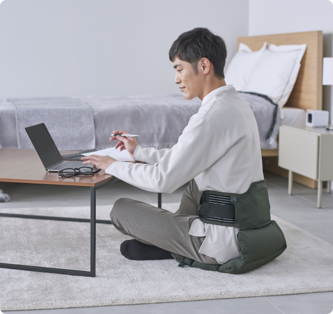 スナップボタンを外してクッションを広げると、お尻の下に敷いて使えます。コルセットで姿勢を整えつつ、長時間の座り姿勢による負担をやわらげます。