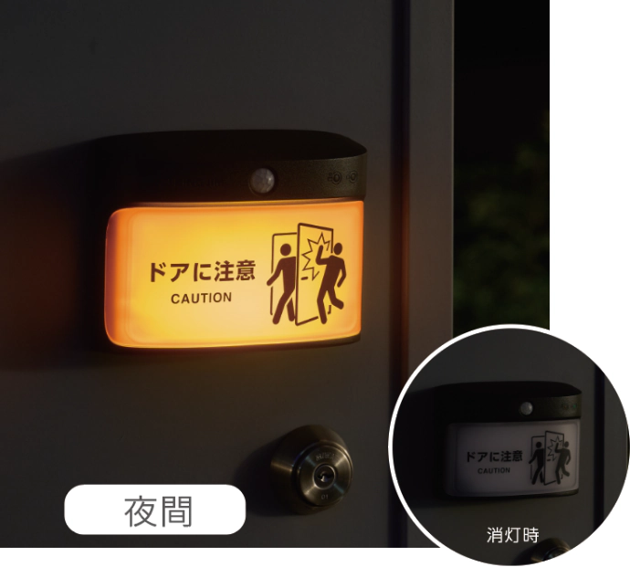 屋外対応だから使用シーンもさらに広がります。屋外や屋内の鉄扉に設置することで、扉の開閉による衝突を未然に防ぎます。