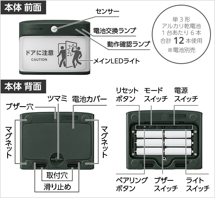 | 電源 | 1台あたり単3形アルカリ乾電池×6本(別売) |