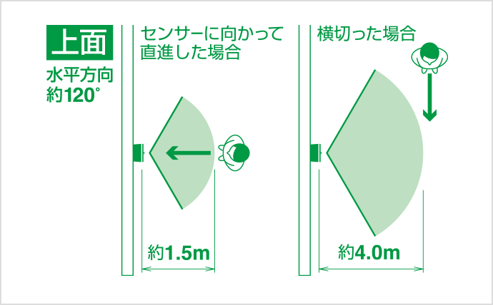 センサーの検知範囲(床から1.2~2mの高さに設置した場合)
