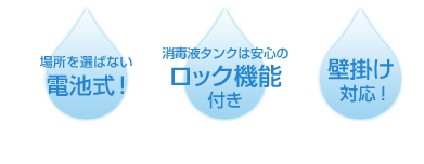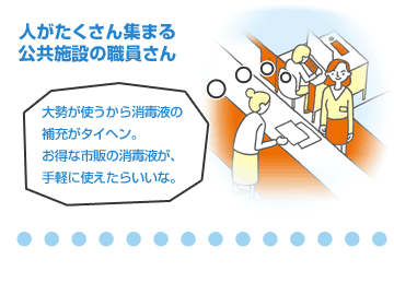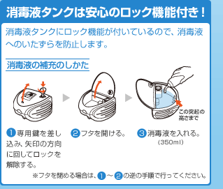 専用鍵を差し込み、矢印の方向に回してロックを解除する。(2)フタを開ける。(3)消毒液を入れる。(350ml)※フタを閉める場合は、(1)~(2)の逆の手順で行ってください。](/resource/images/news/release/img-alsat-14.gif)