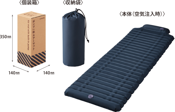 | エアーマット外寸 | 空気注入前:約2,195×700mm 空気注入後:約1,850×650×75mm |