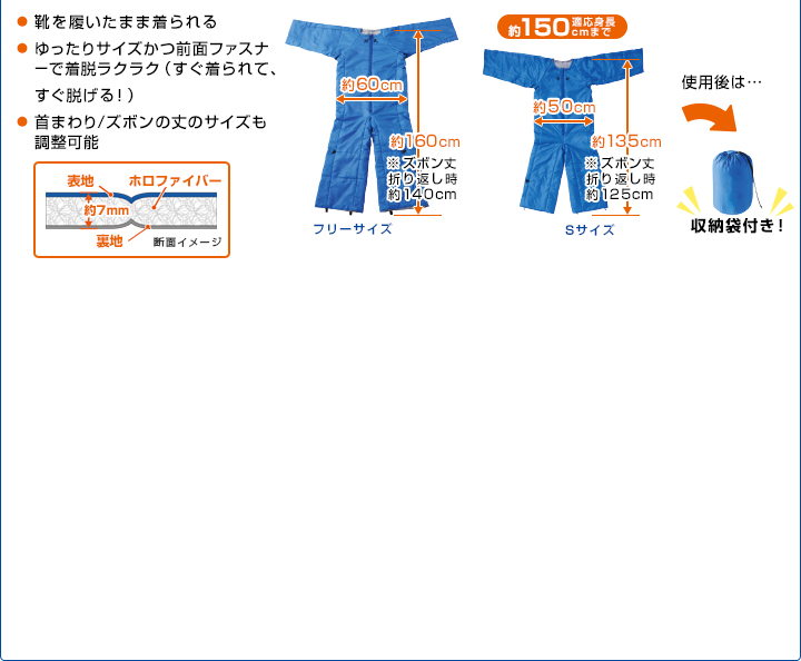 ![靴を履いたまま着られる ゆったりサイズかつ前面ファスナーで着脱ラクラク(すぐ着られて、すぐ脱げる!) 首まわり⁄ズボンの丈のサイズも調整可能 [フリーサイズ]横約60cm 縦約160cm※ズボン丈折り返し時約140cm [Sサイズ]適応身長約150cmまで 横約50cm 縦約135cm※ズボン丈折り返し時約125cm 使用後は収納袋付き!](/resource/images/products/office/img-bft-06.jpg)
