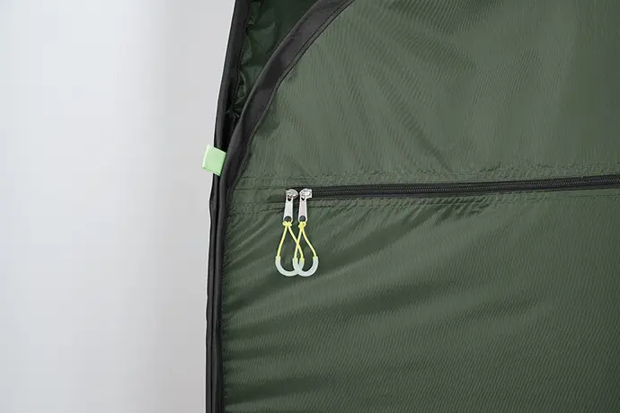 テント外側四隅のタグとファスナーの引き手が光るため、停電後や消灯後も安心です。