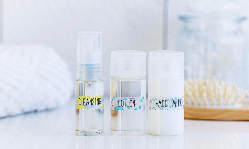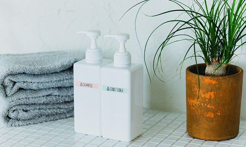 水回りのボトルにラベリングシャンプーなどの詰め替えボトルに、ラベルを貼ってわかりやすく。