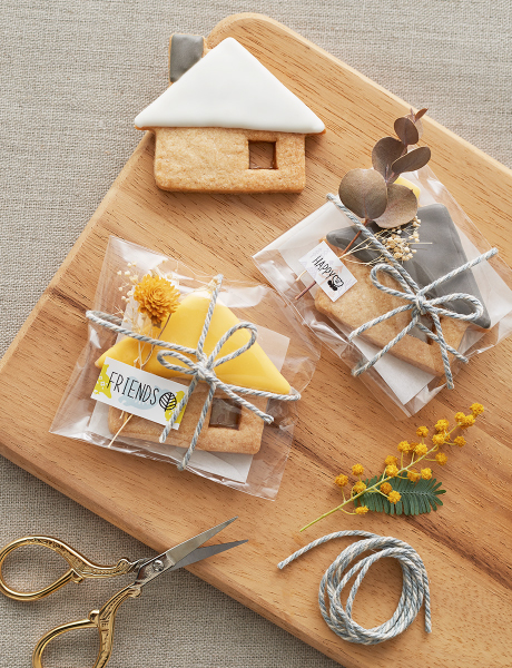 おうち型が印象的なので、同じかたちのクッキーを焼いて、“こはる”を使ってラッピングしてみました。贈る人やシチュエーションに合わせて、印刷する言葉やフォント、テープの柄を選べるのもうれしい。