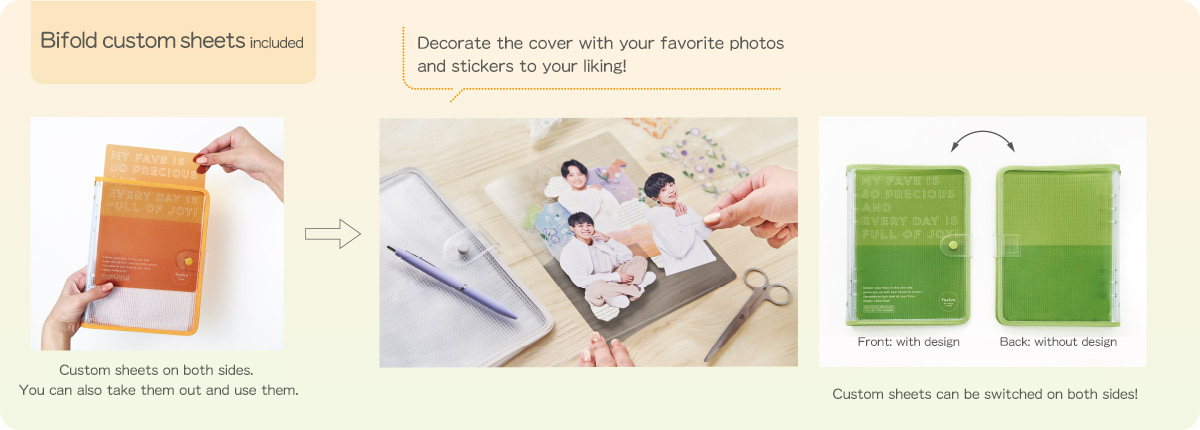 - *When inserting printed materials or photos into the cover, be sure to insert them between custom sheets. Also, make sure they are thoroughly dry before inserting.
