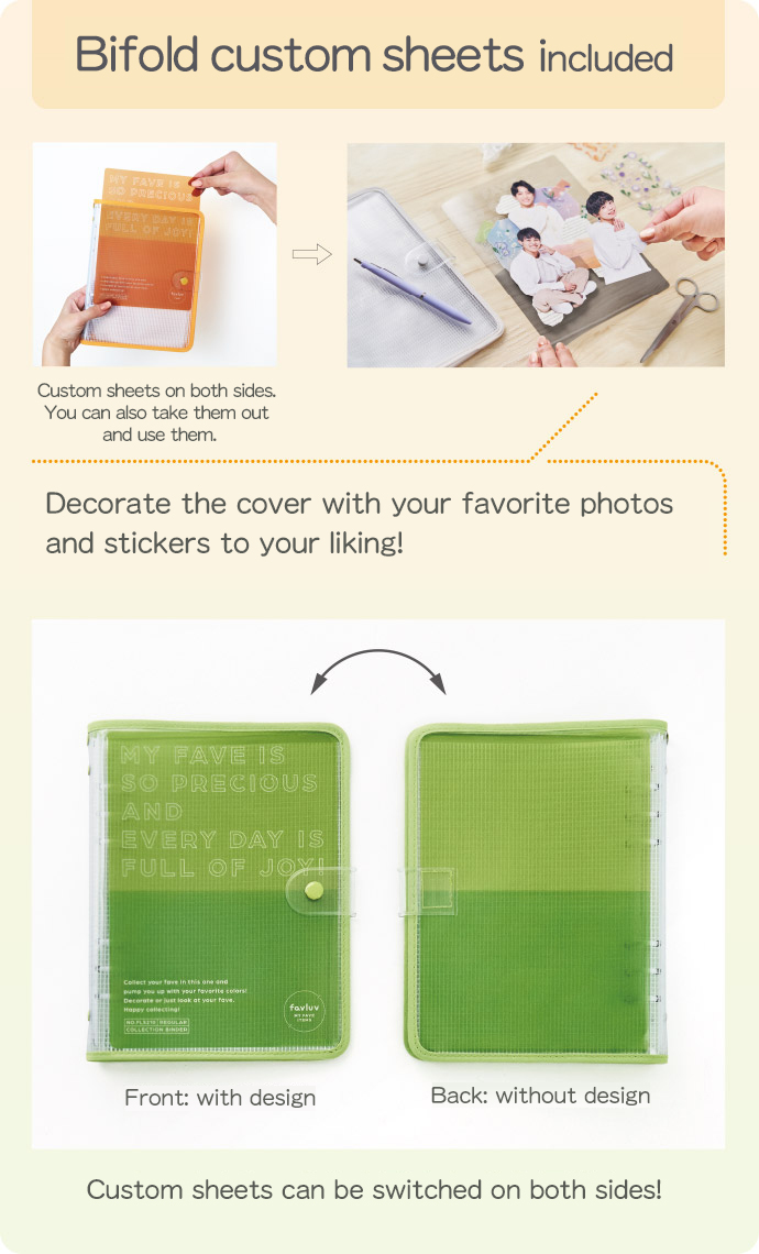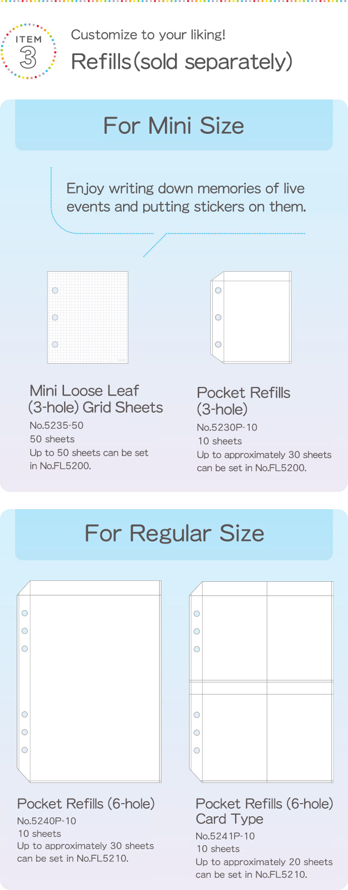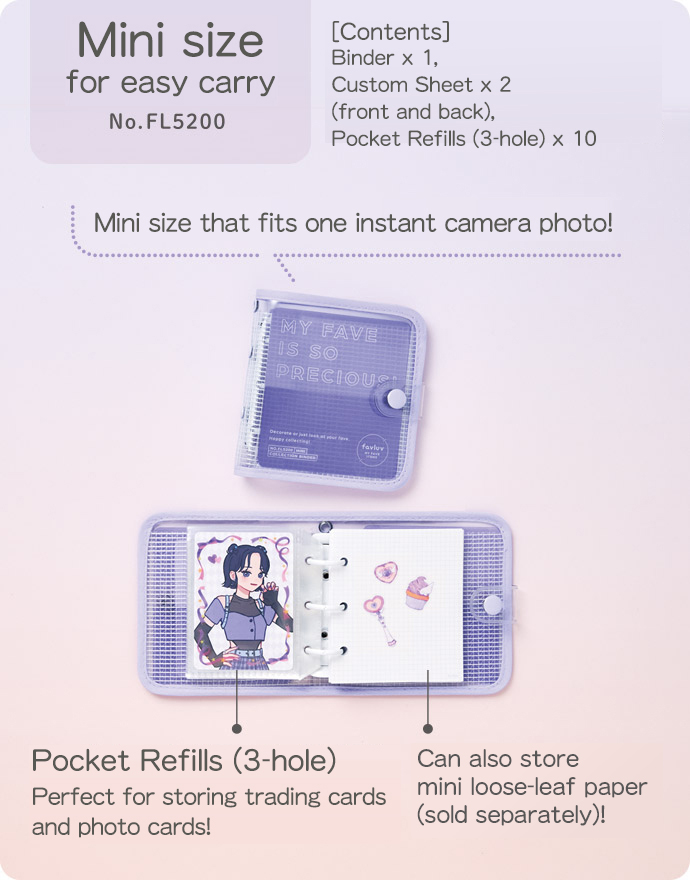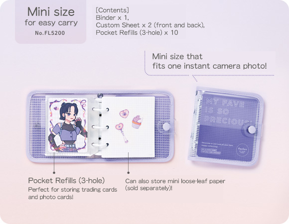 | Contents | Binder x 1, Custom Sheet x 2 (front and back), Pocket Refills (3-hole) x 10 |
