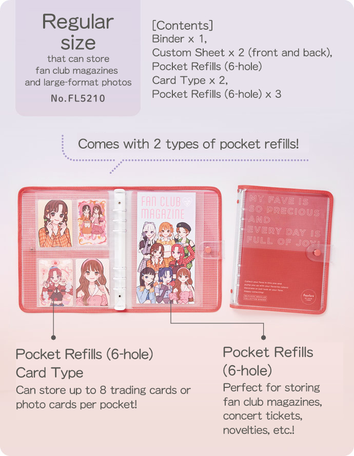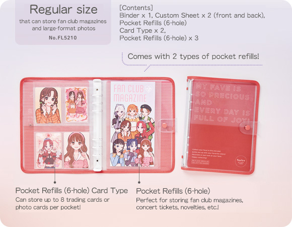 | Contents | Binder x 1, Custom Sheet x 2 (front and back), Pocket Refills (6-hole) Card Type x 2, Pocket Refills (6-hole) x 3 |