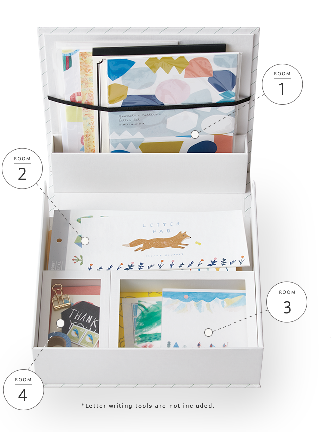 The lower space is for notebooks, the upper space is for pens, clips, stickers, etc.