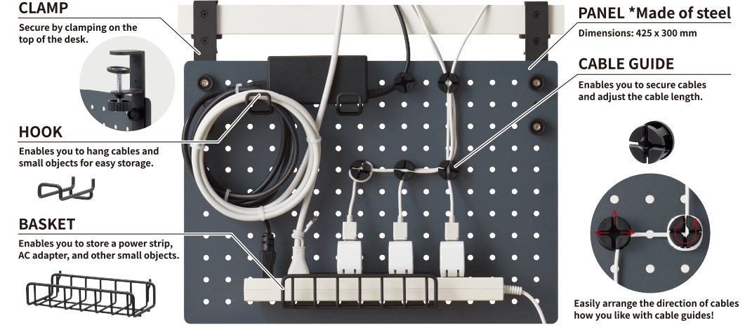 | Contents | 1 PANEL, 2 CLAMPs, 5 CABLE GUIDEs, 2 HOOKs, 1 BASKET |