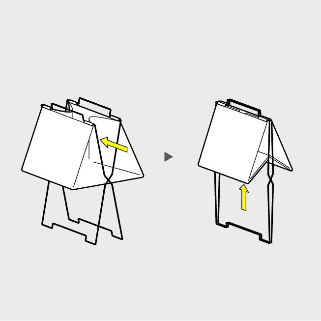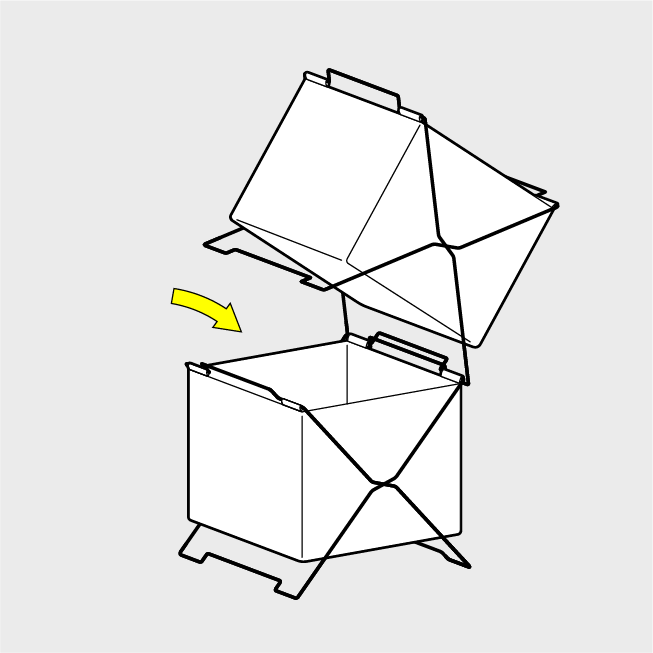 Hook the protrusion on the leg of the frame on the square at the top of the basket to stack it.