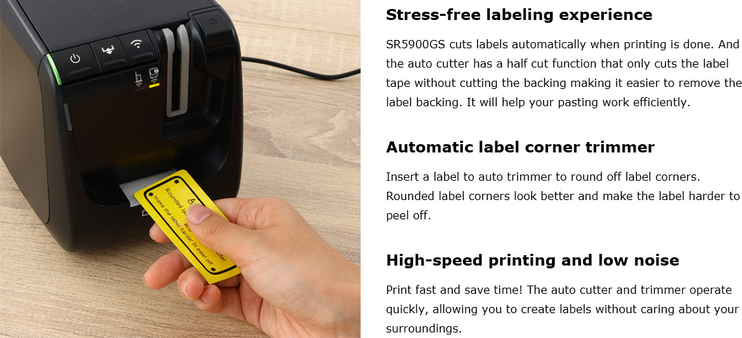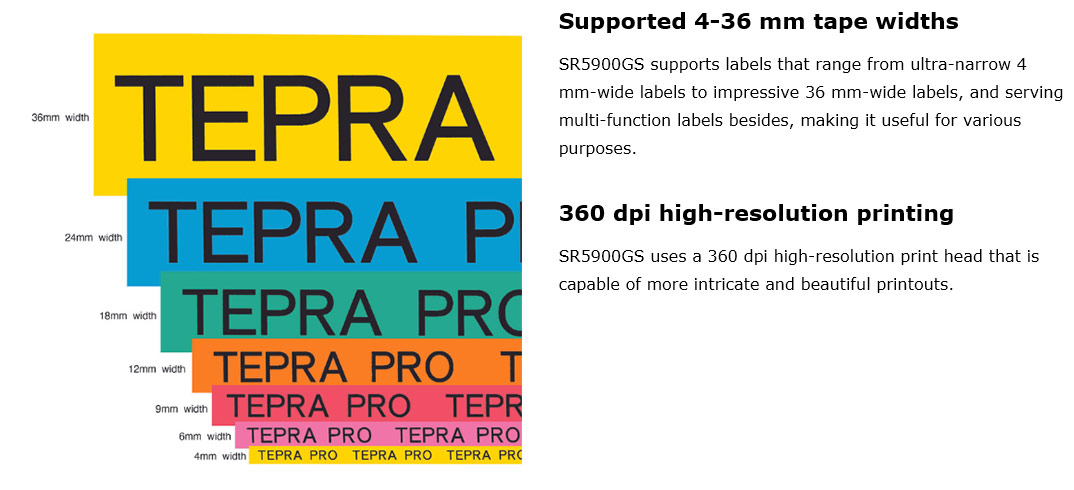 A full lineup of creative and functional tapes is available to meet every usage. SR5900GS is compatible with a wide range of tape widths from 4 mm to 36 mm.