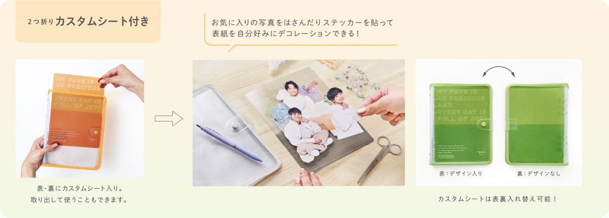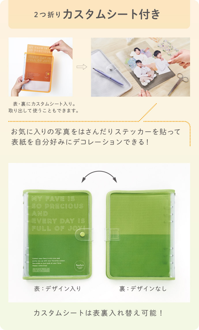 - ※表紙に印刷物や写真を入れる際は、必ずカスタムシートに挟んで入れてください。またよく乾燥させた上で入れてください。