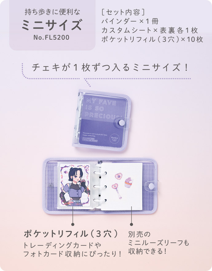| セット内容 | バインダー×1冊・カスタムシート×表裏各1枚・ポケットリフィル(3穴)×10枚 |
