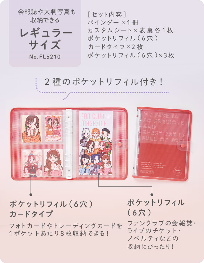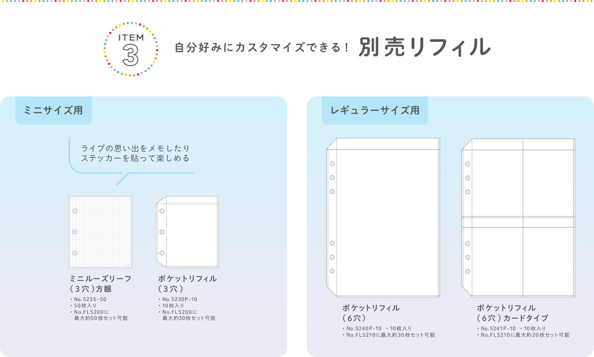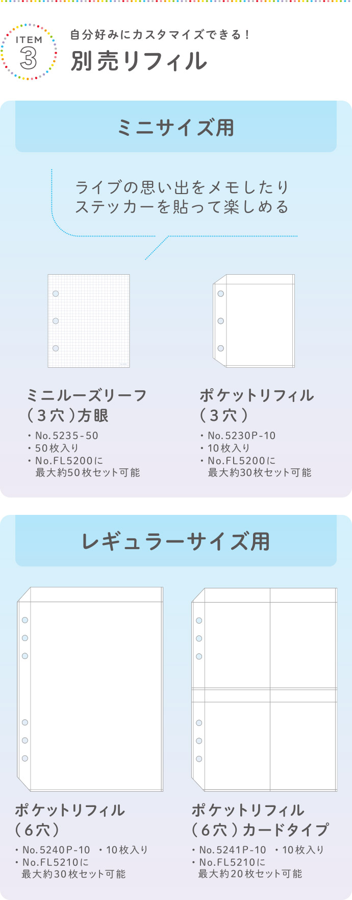 | 最大収納枚数 | ポケットリフィル(6穴)は約30枚、ポケットリフィル(6穴)カードタイプは約20枚収納可能 |