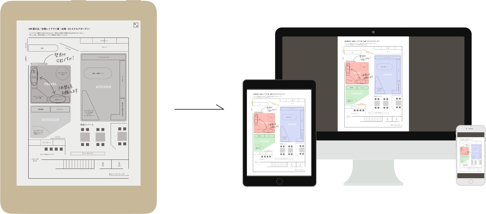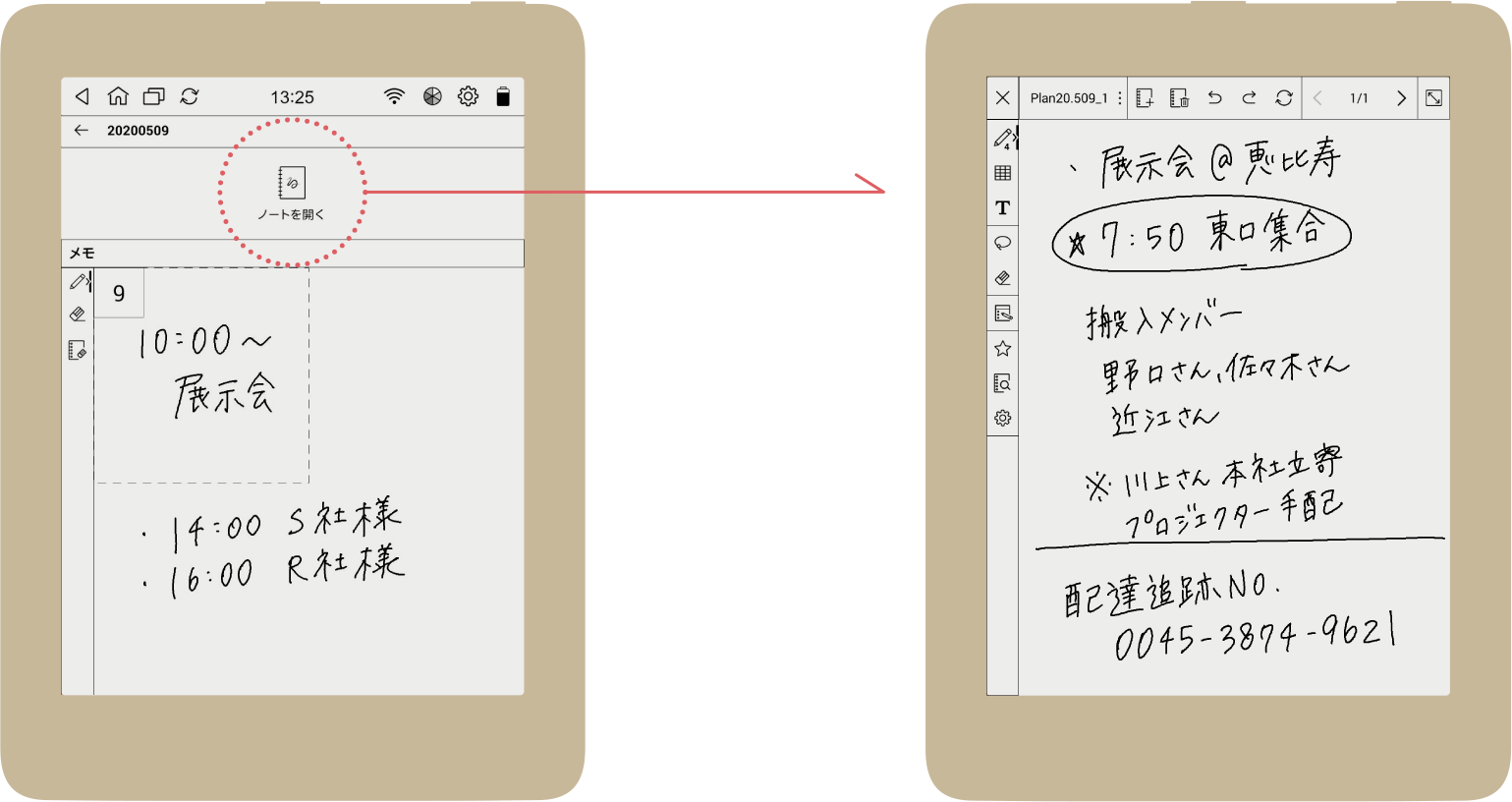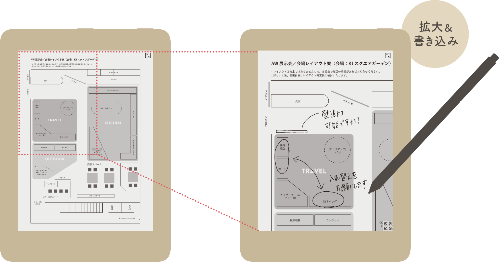 取り込んだPDFは拡大表示ができ、書き込みも可能です。会議資料やマニュアルなど、紙だとかさばる情報もまとめて持ち歩けます。