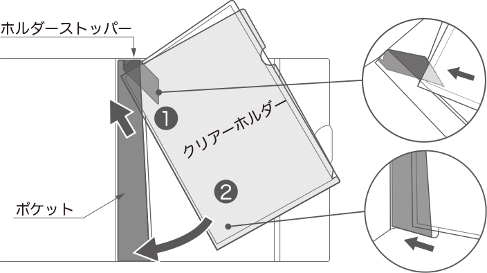 - 1.ホルダーストッパーをクリアーホルダーの左上角に挟み、奥まで差し込む。
