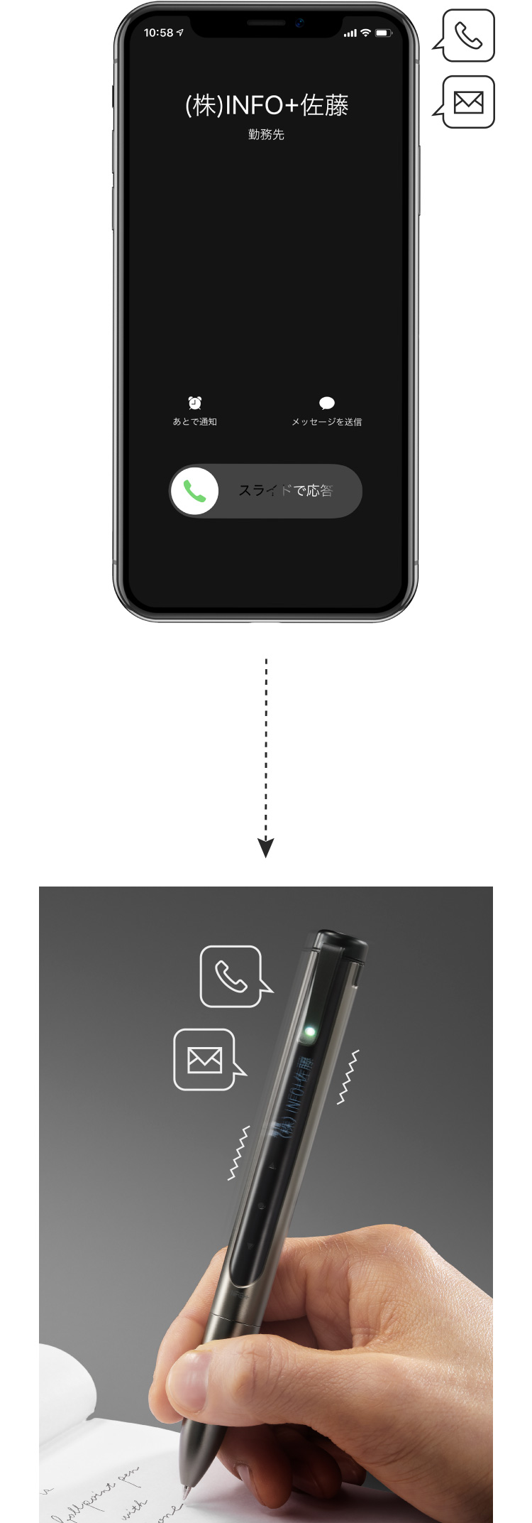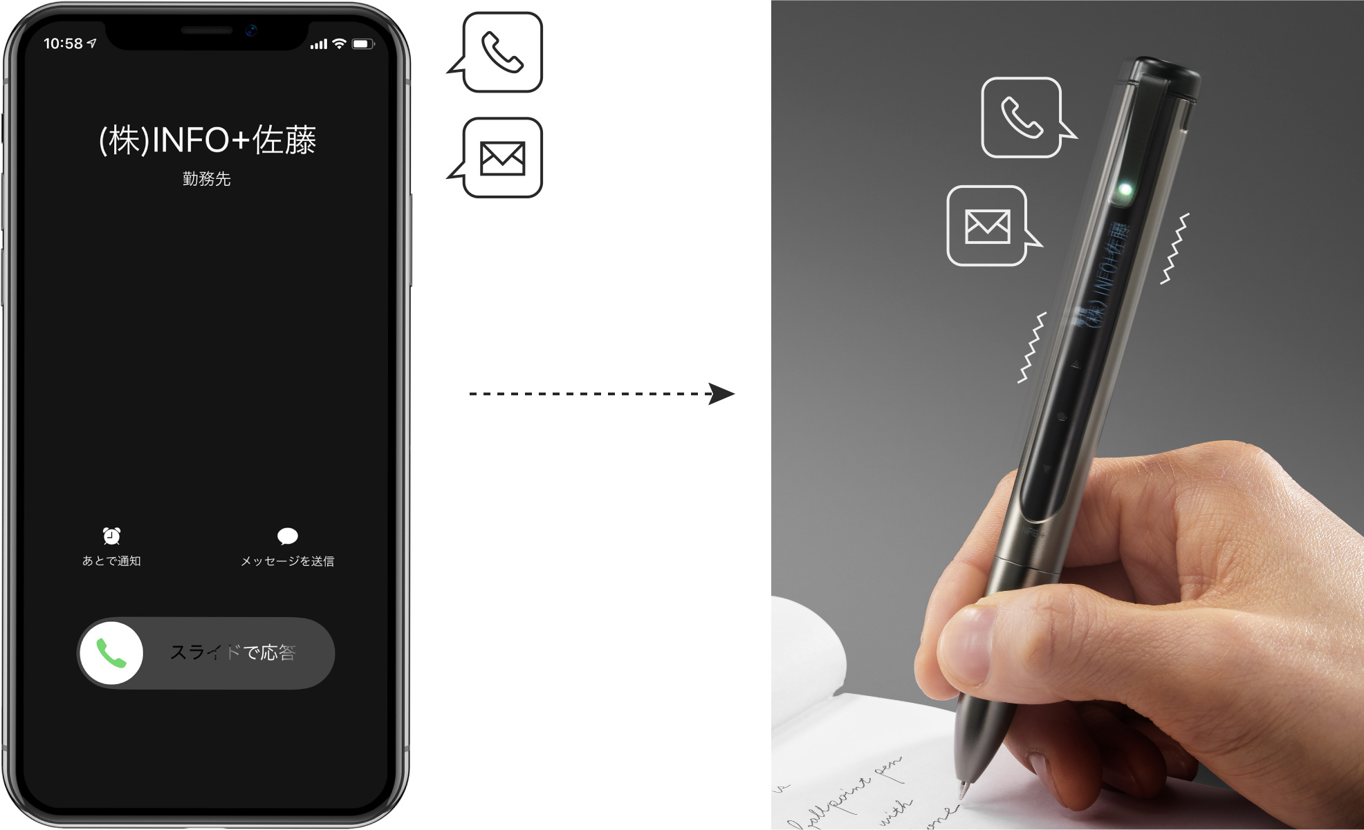スマホと連携。電話の着信やメールの受信、自分宛てのSNSのメッセージなど、アプリのプッシュ通知を振動と小型液晶で知らせてくれます。スマホを取り出さずに内容を確認できます。