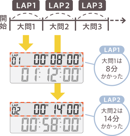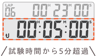 「折り返しカウントアップ」機能で、試験時間との差がわかる