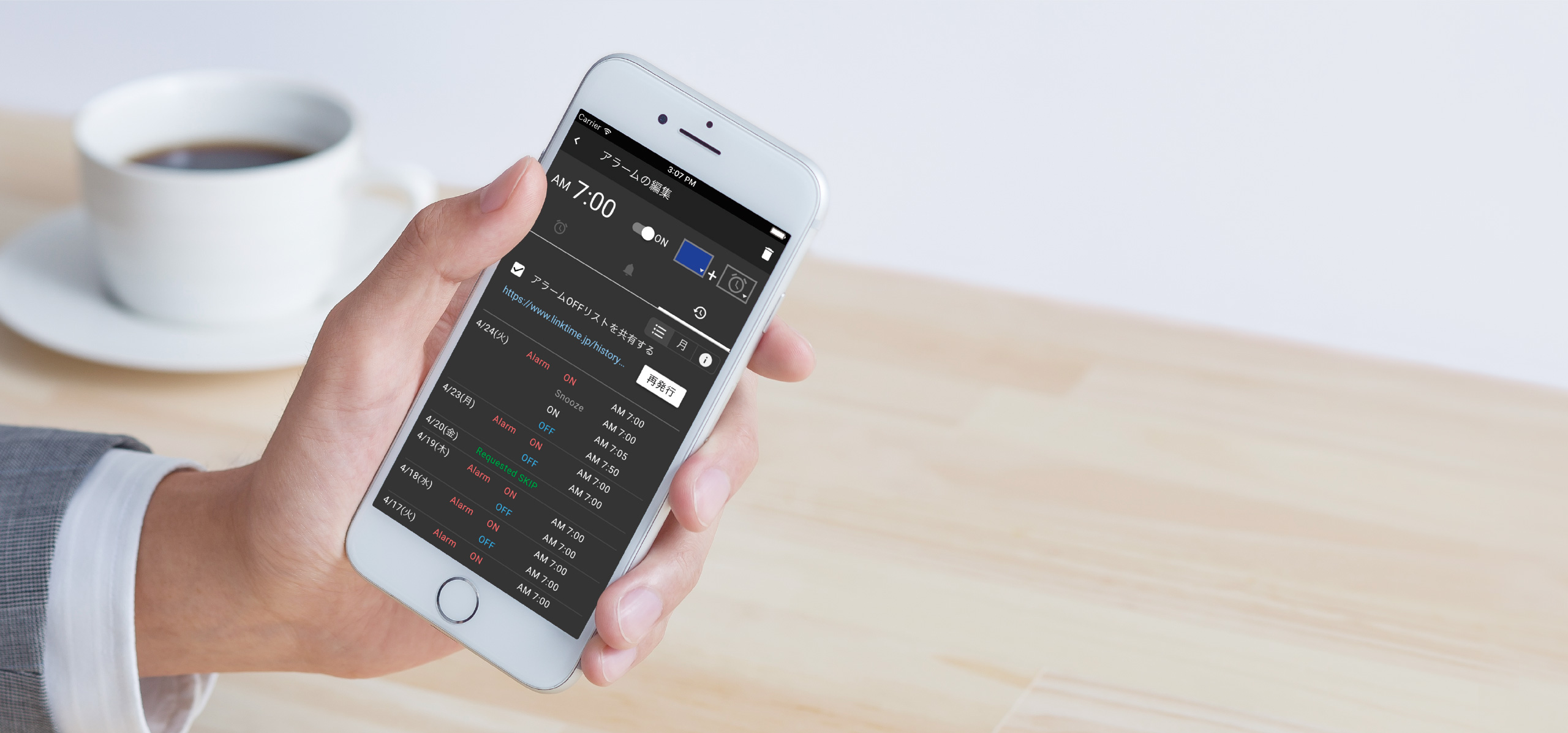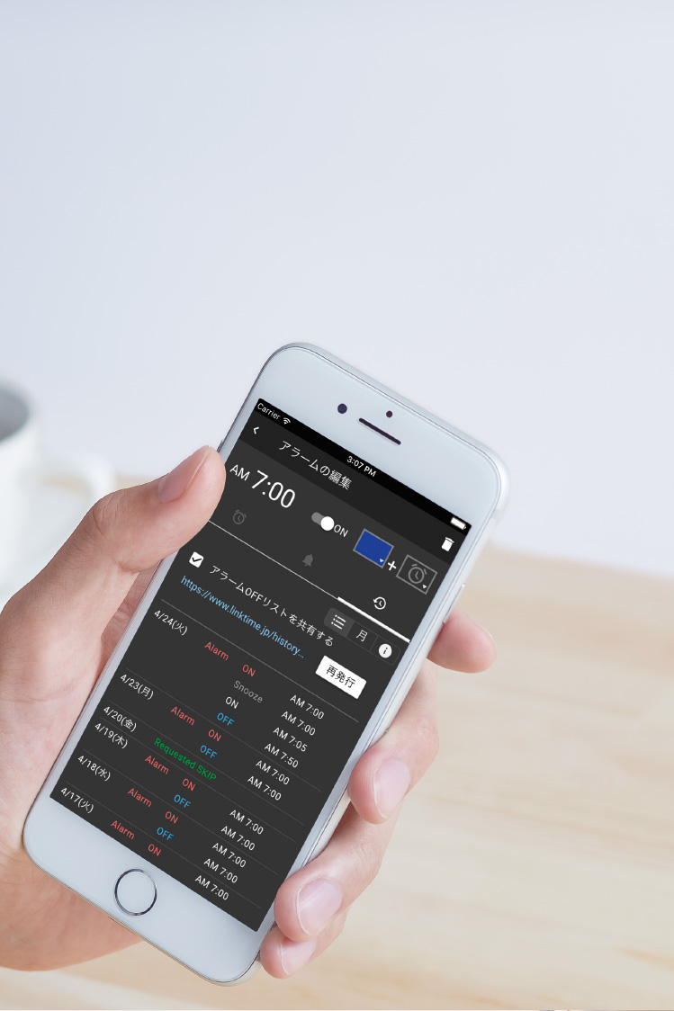 シフト勤務で毎朝起きる時間が違ってもスマホやブラウザから、簡単にアラーム設定。毎日時間を変える必要なし。
