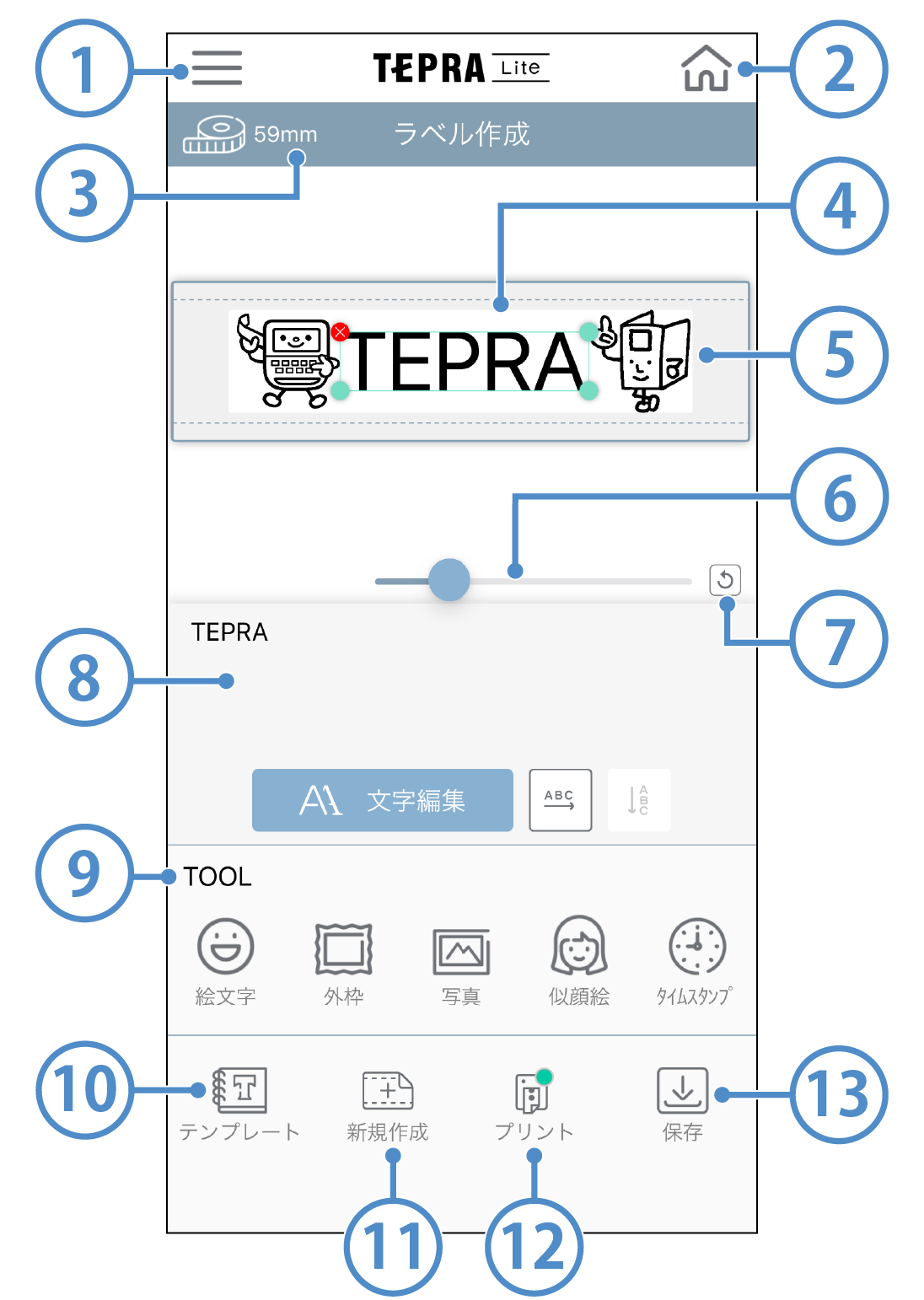 ラベルのプレビューを表示します。タップすると文字や絵文字の編集ができます。