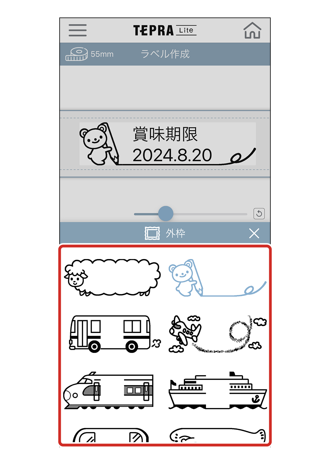 挿入した文字や絵文字によって、外枠が重なる場合があります。必要に応じてサイズを小さくするなど、重ならないように調整をしてください。