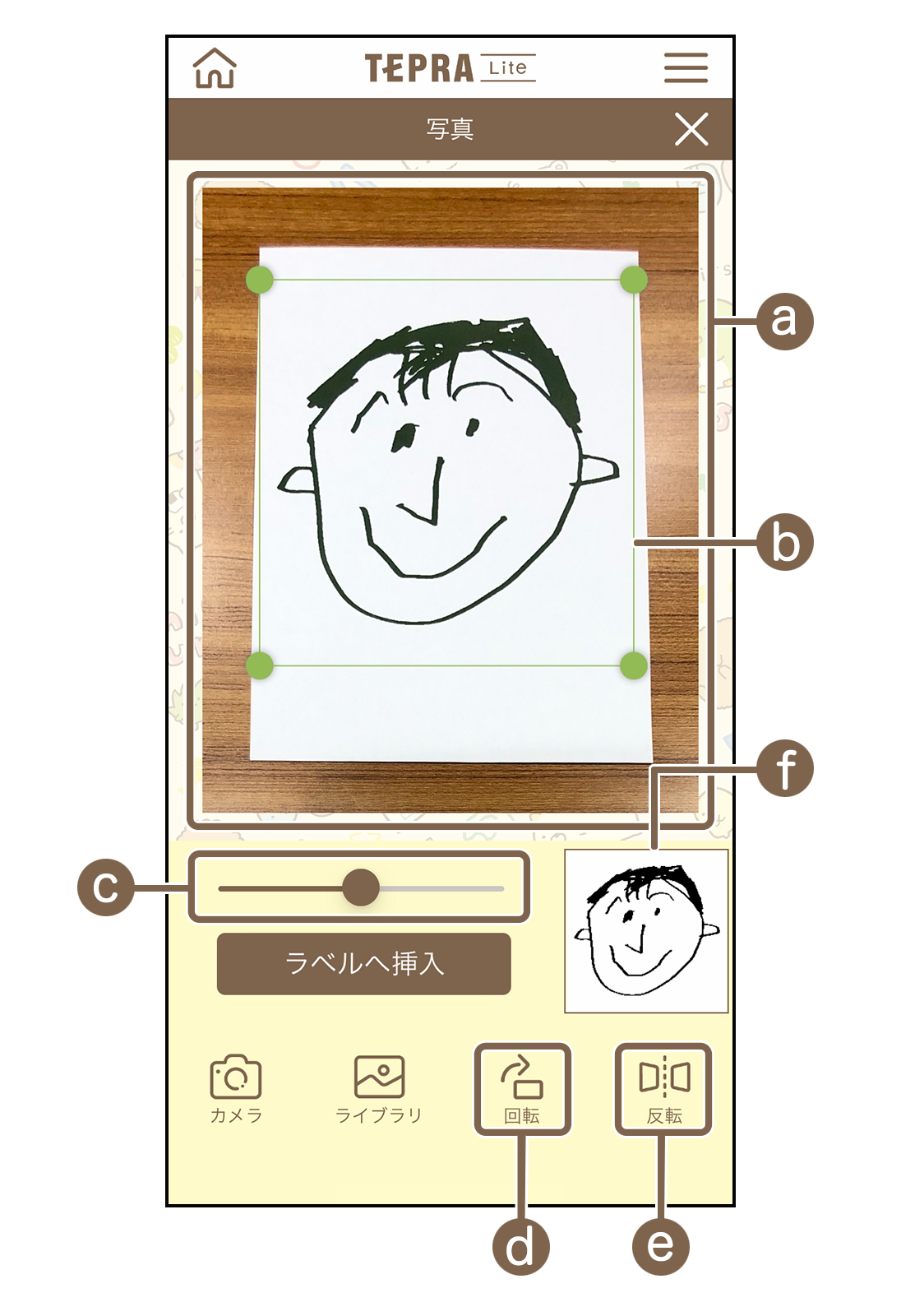 - ラベルに表示されるイメージ(f)を確認しながら、明るさ(c)、写真の向き(d)(e)を調整する
