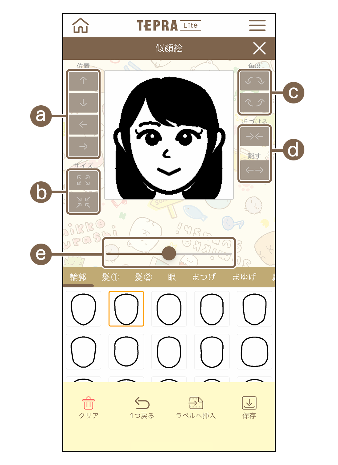 パーツを選択した後に、次のボタンをタップするとさらに細かく似顔絵を調整することができます。位置(a)