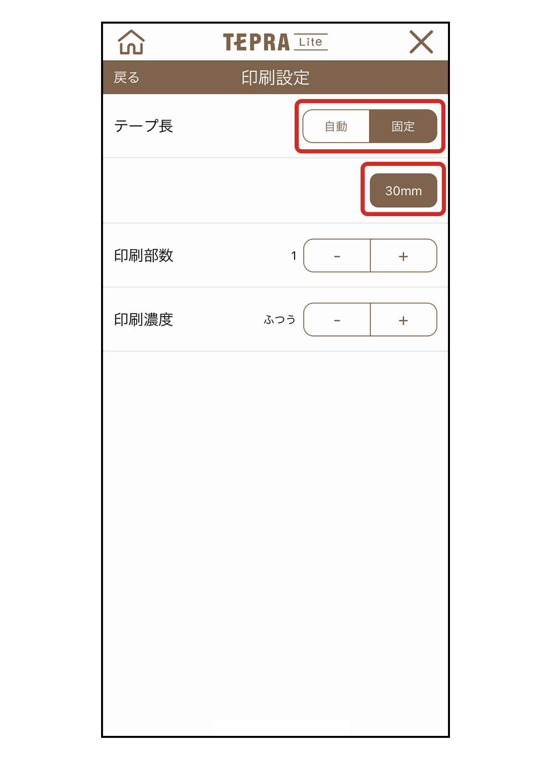 - テープ長を「固定」にし、印刷するラベルの長さを数値で指定する