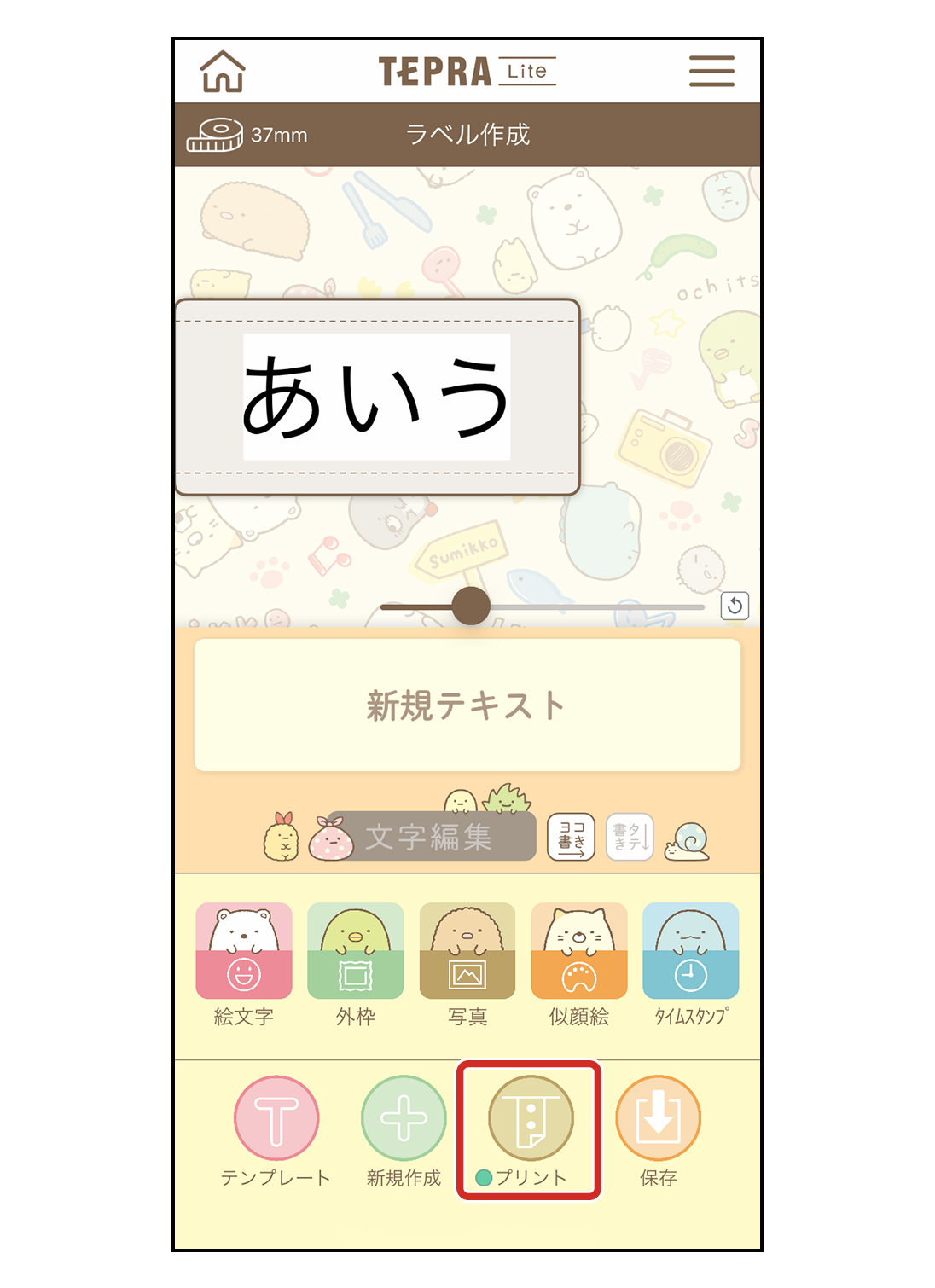 プリント」をタップすると、すみっコぐらし「テプラ」Lite 本体とBluetooth®で接続することができます。