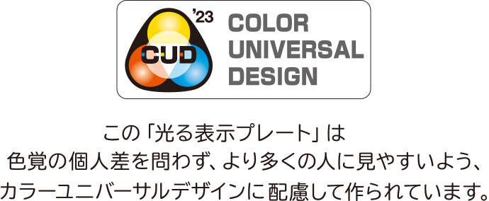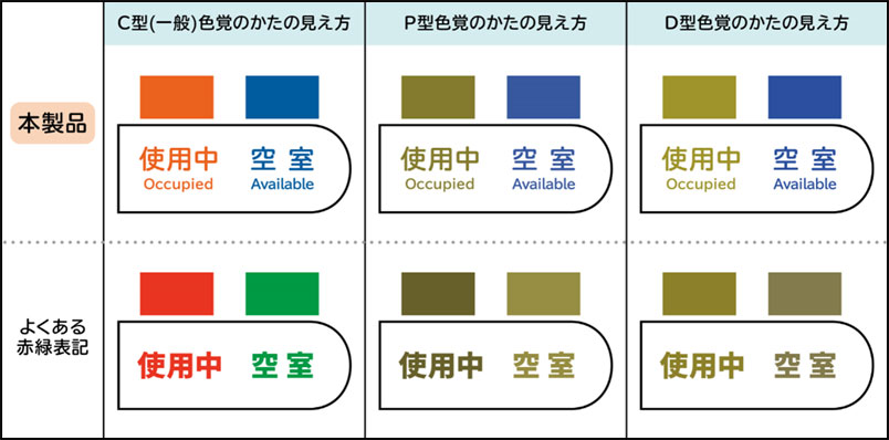 色の見え方には個人差があり、表示プレートによくある「赤と緑の配色」が見分けにくいと感じる色覚(P型・D型)のかたが日本人男性の20人に1名程度、欧米ではさらに多くいると言われています。本製品は色覚の個人差を問わず、より多くのかたに見やすい配色を採用しています。