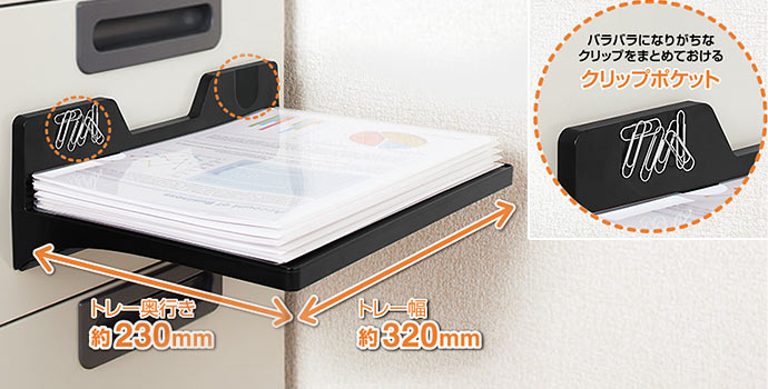 トレー部は約230×320㎜の広々としたサイズで、書類をクリアーホルダーに入れたままでも、はみ出さずに置くことができます。
