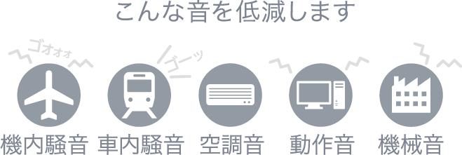 イヤホンに内蔵された小型マイクロホンで周囲の環境騒音を収音。その逆位相の音を出すことで騒音を打ち消します。