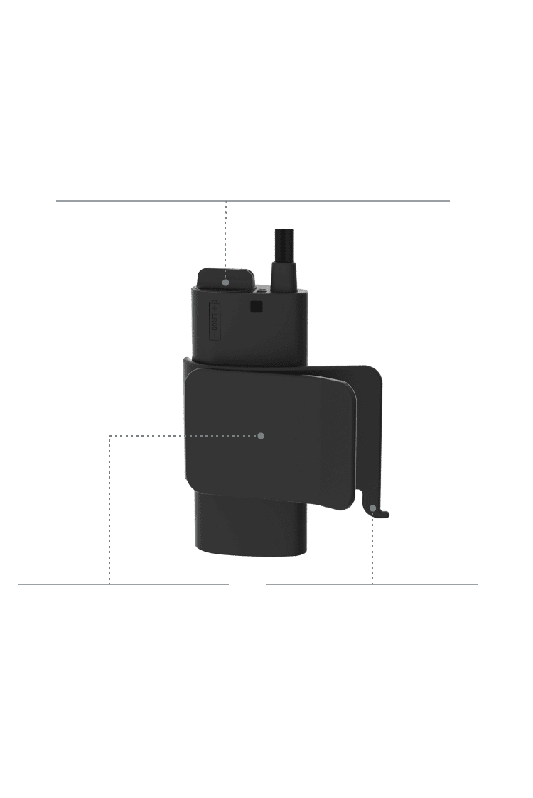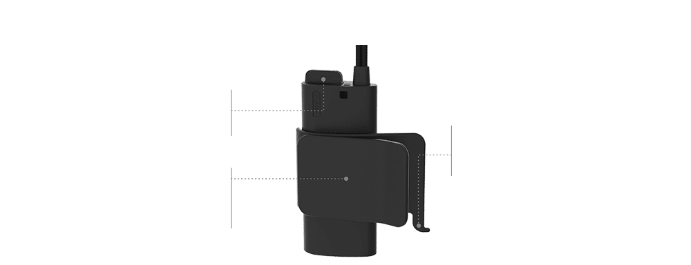 襟元などに取り付けすることができます。取り外しができ、場面に応じて電池ボックスの前後に取り付け位置を変えることができます。