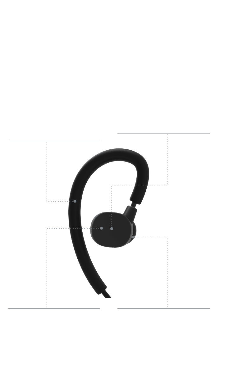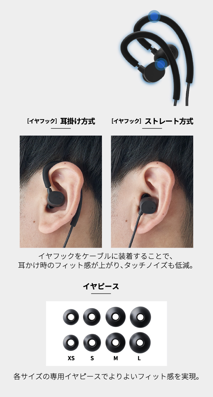 イヤフックをケーブルに装着することで、耳かけ時のフィット感が上がり、ケーブルによるタッチノイズも低減させることができます。