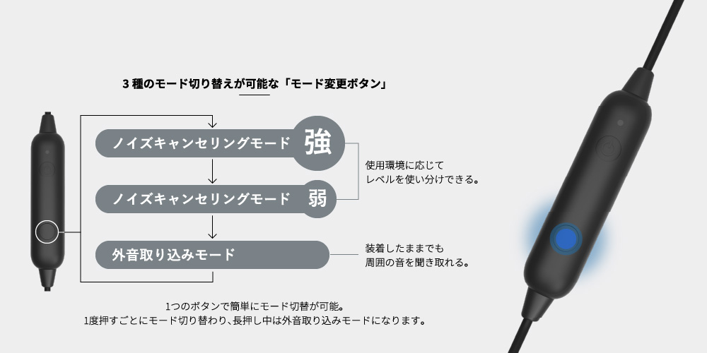 ※電源ONの直後はノイズキャンセリング「強」モードになります。