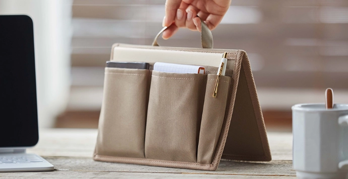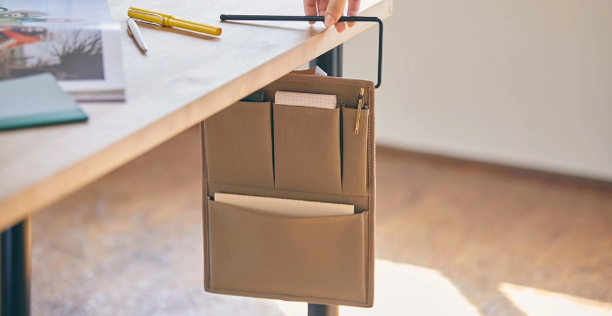 カバンから出してデスクにかけるだけのオーガナイザー。カバンの中でも自立しやすい芯材入りのハード仕様。
