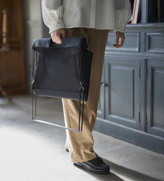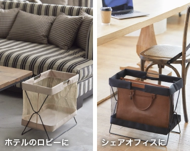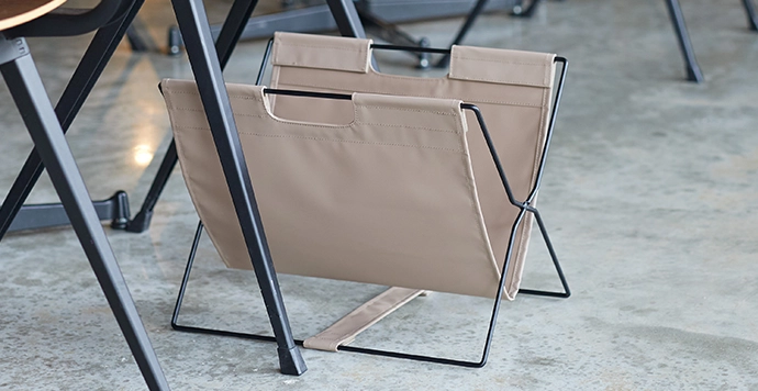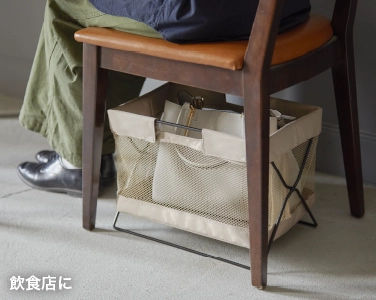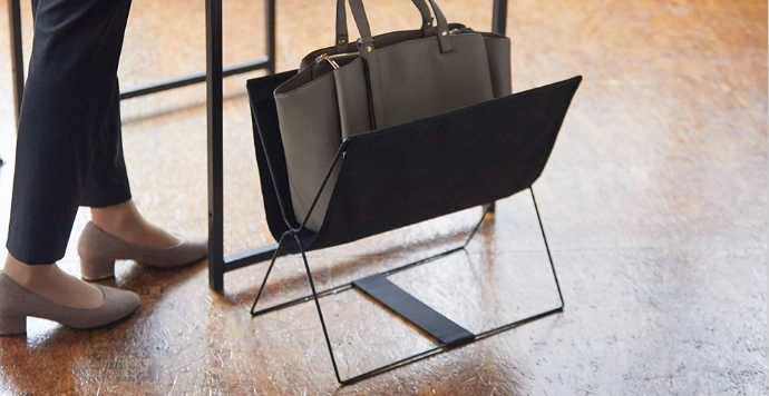 移動も座席周りもスマートに。日常でも店舗でも使いやすい、シンプルな見た目と機能のサイドバッグスタンド。