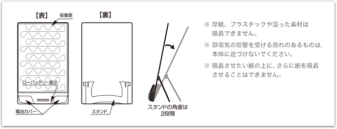 ※ 厚紙、プラスチックや湿った素材は吸着できません。