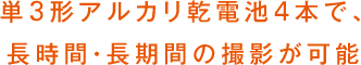単3形アルカリ乾電池4本で、1秒間隔で約5,000枚、1日間隔で約730枚の撮影が行えます。別売のレコロ用ACアダプタを使えば、最大99,999枚もの連続撮影が可能になります。