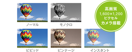 1,600×1,200ピクセルの高画質カメラを搭載。動画投稿サイトに鮮明な画質の動画を投稿できます。撮影シーンに合わせノーマル、モノクロ、ビビッドなど5種類のエフェクトから選択できます。