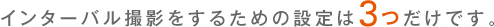どのくらいの間隔で撮影するかを設定。1秒~1日の間隔で選択します。マニュアルモードに設定すれば手動での撮影も可能です。