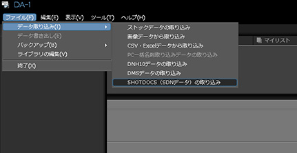 「SHOTDOCS」のストックを選択した状態で、「ファイル」>「データ取り込み」>「SHOTDOCS(SDNデータ)の取り込み」を選択します。先ほど任意の場所に保存したファイルを選択すると、データを取り込めます。