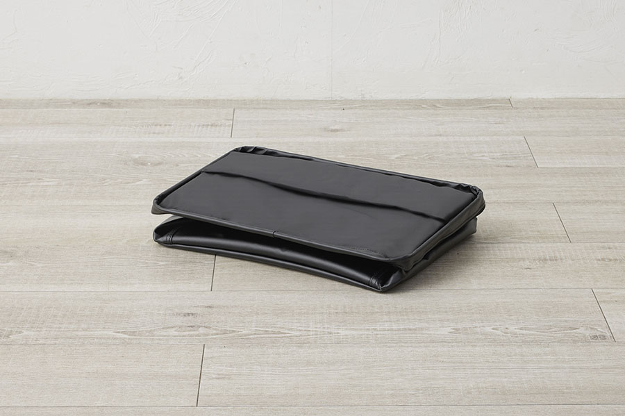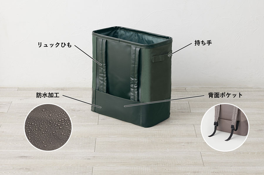 自立するため、据え置きとしても使用できます。リュックひもを収納できる背面ポケット付きなので見た目もすっきり。