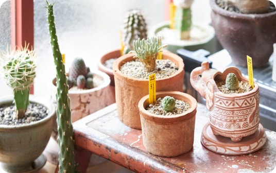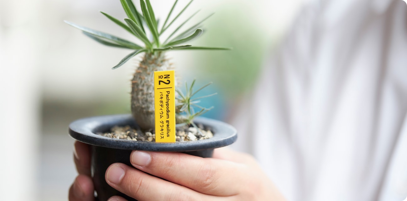 趣味で始めた観葉植物が今では400鉢近くに。「TEPRA」なら小さい文字や長いアルファベットの名前も見やすく印刷できます。今後は植物の販売等の可能性も含め、お店のロゴを取り込んでレイアウトしたラベルも作ってみました。ロゴ入りのラベルを貼るだけでオリジナルグッズを作れるので、展開する商品やサービスの幅も広がっていきそうです。