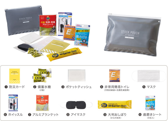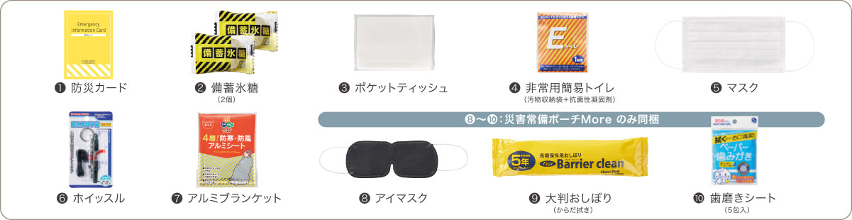 | セット内容 | 防災カード、備蓄氷糖(2個)、ポケットティッシュ、非常用簡易トイレ(汚物収納袋+抗菌性凝固剤)、マスク、ホイッスル、アルミブランケット、アイマスク、大判おしぼり(からだ拭き)、歯磨きシート(5包入) |