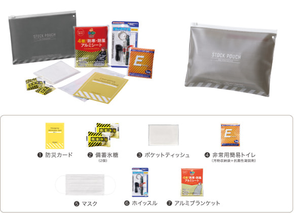 | セット内容 | 防災カード、備蓄氷糖(2個)、ポケットティッシュ、非常用簡易トイレ(汚物収納袋+抗菌性凝固剤)、マスク、ホイッスル、アルミブランケット |